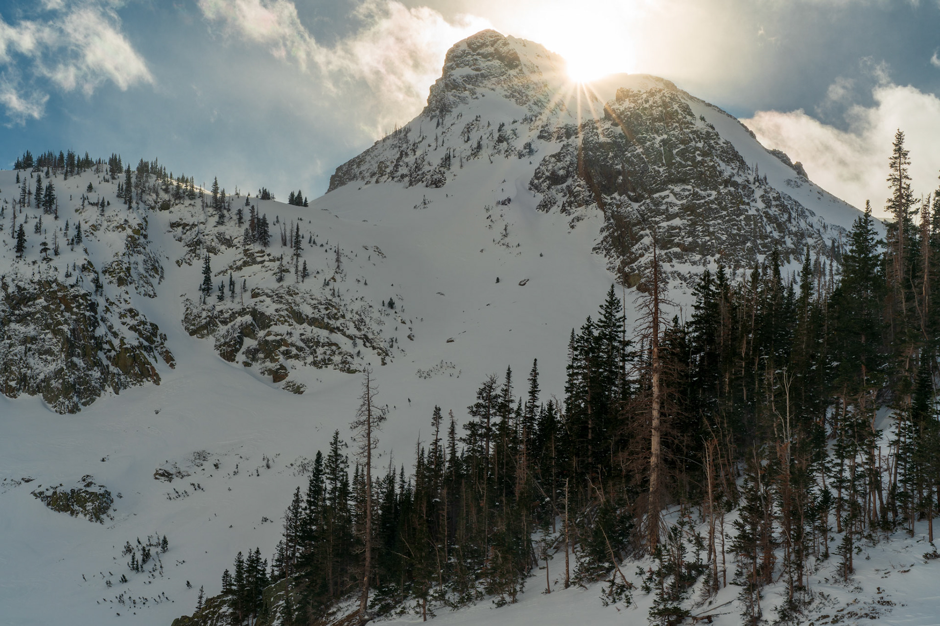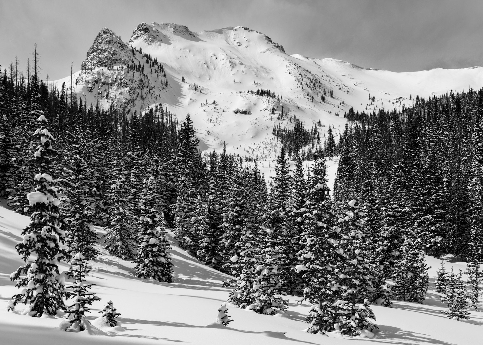 It was a blue bird day high in the Arapaho and Roosevelt National Forest, but also a breezy one. When I came to a ridge above treeline, I noticed that I was not alone. A pair of skiers were skinning up to the summit of the Continental Divide before me. I really enjoyed how they provided scale in this divine, but moody scene.